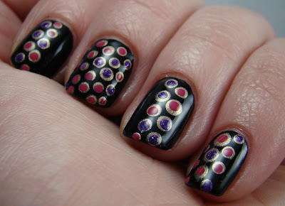 I started with 2 coats of Finger Paints Black Expressionism. I added gold dots with Spa Ritual Gold Digger. Then I used China Glaze Fuchsia Fanatic and Gothic Lolita from their new Electropop collection for the pink and purple dots. I wanted the purple to pop a little more, so I layered Zoya Mimi over Gothic Lolita to add some sparkle.