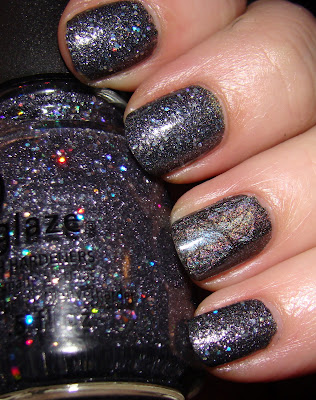 I started with one coat of Color Club Revvvolution, a black holo, on each nail. I then added one coat of China Glaze Some Like It Haute, a graphite and silver glitter with larger holo glitters scattered through it. Finally, I took the diamond part of this challenge literally and stamped two diamonds on my ring finger. I used the pattern from Bundle Monster plate BM-09, and stamped with Color Club Worth the Risque.