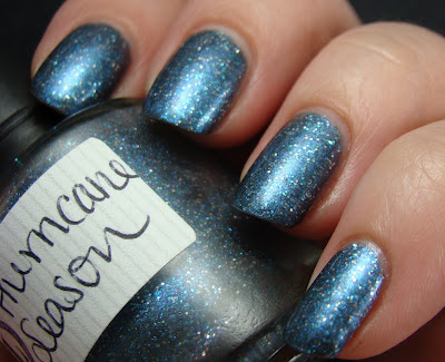Helloooooo!! Today I have another Nail-Venturous Lacquer to show you! This one is called Hurricane Season, and is part of Amy's Louisiana Southern Hospitality Collection. It is a gorgeous grayed-blue shimmer base, with small light blue and silver glitters throughout. This definitely looks like foreboding gray storm clouds... the really dark kind that have a hint of blue to them.