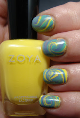 I had some trouble with this because in my mind it was necessary to have a yellow in my design, and my only yellow creme polish is Zoya Pippa, which just did not cooperate too well with the water. It didn't want to spread properly, and made this all very difficult! I will have to add another yellow to my collection to use with my water marbles in the future.