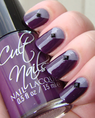 For these I used 1 coat of Cult Nails Vicious, then I taped off the V shape at my cuticle and painted one coat of Cult Nails My Kind Of Cool Aid. I then placed the square black rhinestone at the tip of the V. It wasn't until after I finished that Mr. Sparkles suggested adding the line down the middle, so I did that freehand with a striping brush. If I had planned on adding it I likely would have done so before the rhinestone in order to get a more neat line, but oh well! I am still really happy with how this turned out. I hope you guys like it too. :)
