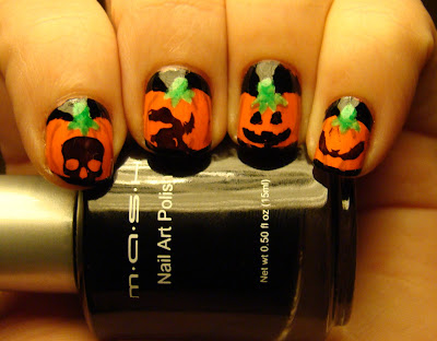 Hey all you Witches and Warlocks! Ready for another round of Halloween nail art? Today's challenge was to make some Jack-O'-Lantern nails. I actually had a tough time with this... because my nails are so short right now it is difficult to have enough room for proper nail art! So, what seemed like a good idea in my head didn't translate quite how I wanted onto my nail. (I liked these better when they were just pumpkins, before the designs!)