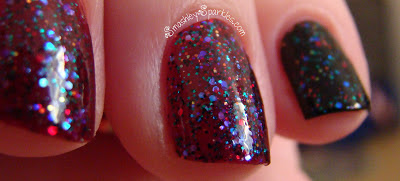 Taylor has a deep red jelly base, with red, green and blue glitters. The blue glitters are the iridescent, glowy blue kind, like the ones that can be found in Lynnderella BoF. This polish is AH-MAZING guys!!! Taylor is my favorite of the polishes that I recieved from Cindy. I haven't seen anything like it before, and I love that.