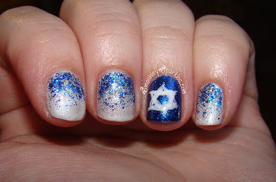 I chose to feature the colors of Hanukkah in my mani, using white, blue, and silver. The base color is Orly Au Champagne, and then I did a glitter gradient using China Glaze Lorelei's Tiara and Models Own Bluebelle. For my accent nail I used 2 coats of Orly Lunar Eclipse and painted a Star of David using my MASH Nail Art Polish in White.