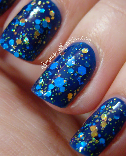 First up we have Candeo Colors Snowbird. The description as stated on the Candeo website is: "Snowbird is a mixture of matte blue hex in various sizes with small holographic lime and small and medium gold holo hex in a clear base." That is definitely spot on, I don't see anything more than what is described there. I really enjoy the contrast of the matte and holo glitters in this polish, I think it is quite interesting. The formula on both of these Candeos are great, easy to work with and not too thick. I have shown one coat of Snowbird over two coats of Ciaté Power Dressing, a dark blue jelly. I did do a small amount of pushing glitter around so it was spread out a bit more evenly, but that was mostly because of my perfectionism. It probably wasn't necessary.