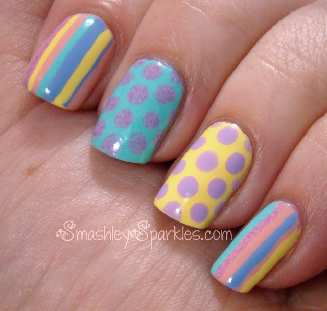 I did some cutesy pastel dots and stripes for this mani. The colors I used are H&M Norwegian Sky, Orly Lemonade, Dandy Nails Flamingo Kisses, Depend Nr. 347, and Nails Inc Bluebelle. The stripes have been freehanded with a striping brush and the dots were with a dotting tool.