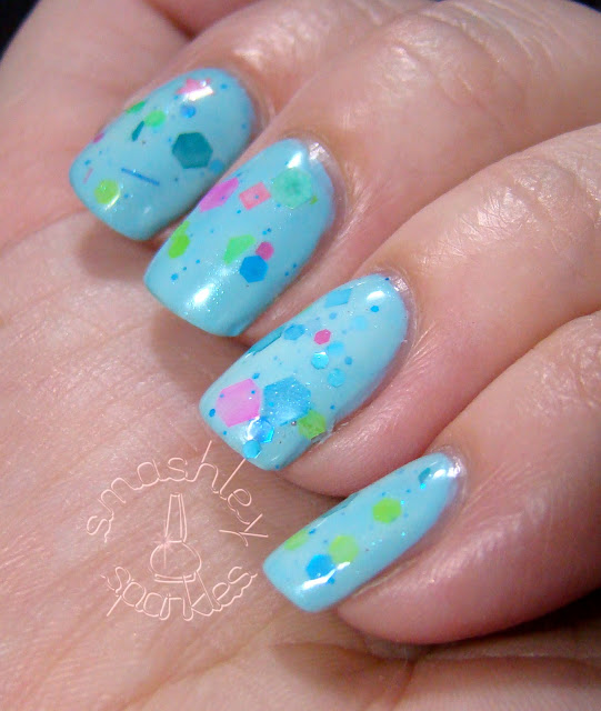 This is BirdBrain Blue from the Everything's Coming Up Neon collection. Lynn's description of this polish is "BirdBrain Blue has scattered cyan, turquoise, magenta, neon blue and green, neon pink and pastel satin aqua glitters in a soft, translucent robin's egg aqua base with matching shimmer."