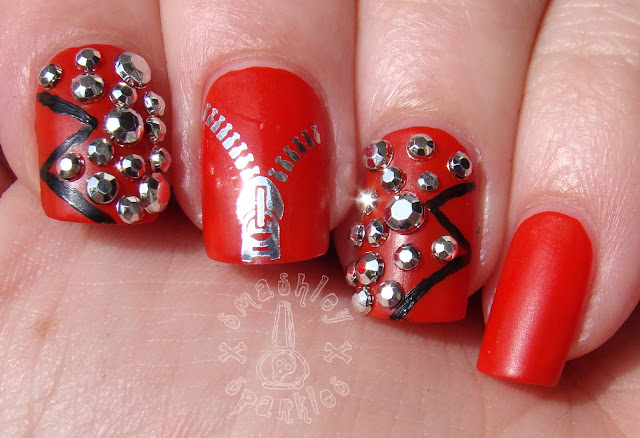 This mani started off with two coats of Ciaté Dangerous Affair, and one coat of MASH Matte Polish top coat to make them semi-matte like leather. (If only I had the leather effects from Nails Inc for this mani!!) Next I added the water decal of the zipper to my middle nail.