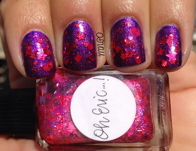 I know Ashley loves the color purple and Lynnderella polish so I decided to pair the two together for a fun and pretty mani. So I decided to start this mani with purple. This is Catrice Forget Me Not. It's a gorgeous deep grape purple with a metallic finish. The color is so saturated and sparkly, the formula was perfect and it went on like a dream! If you use a thick coat you can get away with 1, but I err on the light handed side so I used 2 coats. Then I used one of the new Lynnderella's from the Once Upon A Prince and More ManCandy collection. Oh Eric…! was one of my top choices because I am a big fan of Eric Northman (Alexander Skarsgard). Oh and hello he's from Sweden, where our dear Smashley currently resides! So that made the choice of glitter topper even more perfect. Oh Eric…! is a blend of "red metallic with neon pink, purple and red glitters in a pink-shimmered translucent red base." It's packed full of stars, squares, hexs, diamonds and circles. I even got a couple hearts on my right hand! It's gorgeous and I absolutely love it over the purple base. I used 2 coats of Oh Eric…! and finished off with 2 layers of topcoats (6 layers of polish total for those of you who are counting). On to the pictures…enjoy!