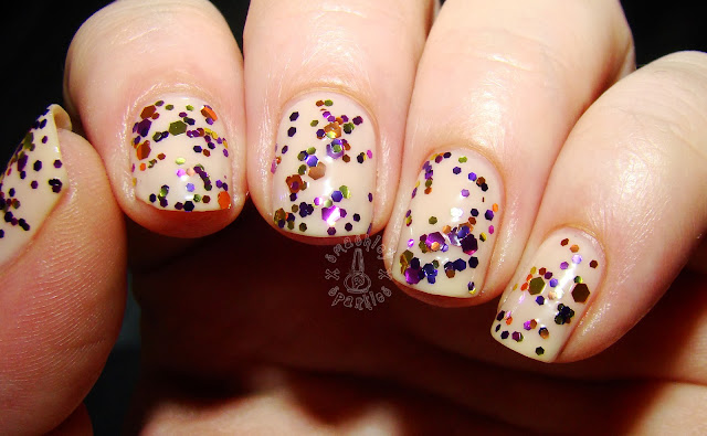 I then layered one coat of Linda Johansen Samba over WW. Samba is a glitter topper which includes 2 different sized hexes in a mix of purple, magenta, orange, and gold. I think this is a really pretty glitter mix for fall. There is some reflective curling with these glitters because they are all metallic, but everything was flat on the nail. I found that the application of this was best done with the dabbing method. When I attempted to drag, like I would with a normal polish, the glitter tended to want to clump up a bit, which you can see on my ring finger. I did get plenty of glitter onto the nail with just one coat though, so that was really nice!