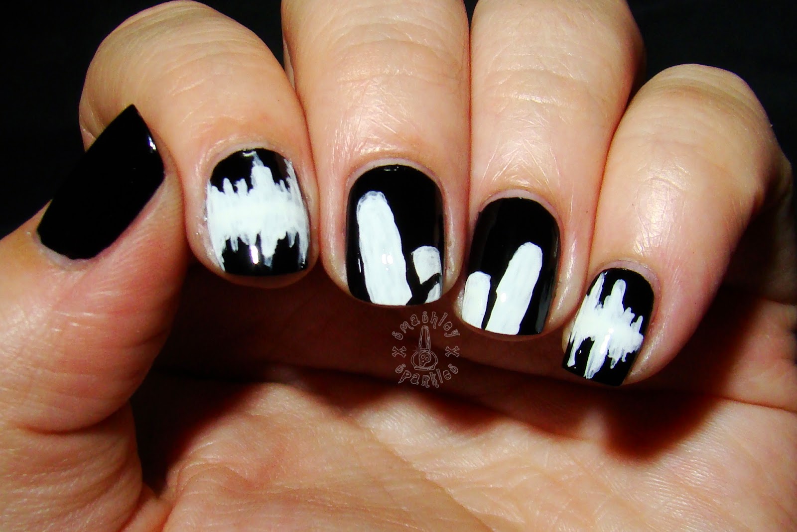 My base for this mani is my go-to one coat black, Cult Nails Nevermore. I did my art with acrylic paints for more accuracy. I've done the metal hand sign across my middle and ring fingers, and the other two accent nails are meant to look like a sound wave. I think this would be a fun mani to wear to a concert some time. :)