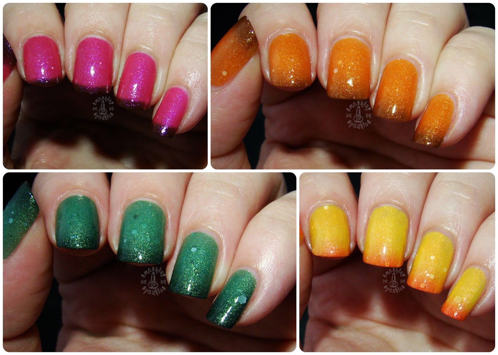 First up we have A Summer's Wave Goodbye, "An orange leaning red when cold, that transforms into a bright light yellow when hot. As fall comes nearer we’re waving goodbye to the hot summer that’s leaving." The picture above shows the natural finish, which is a satiny matte. All of Jin's thermals have this type of finish without top coat. The rest of the photos will show polishes with top coat. All the polishes are shown with two coats.